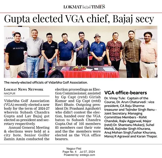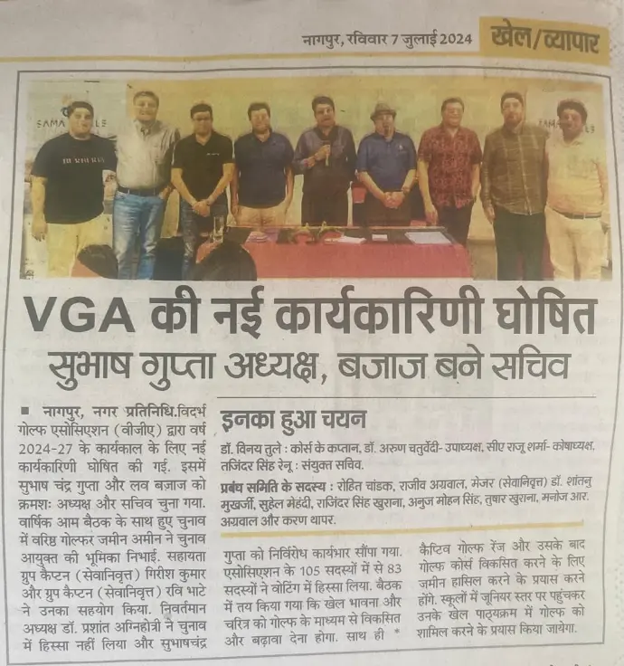 The General Body Election of Vidarbha Golf Association for session 2024 - 2027 was held on 30th June 2024 under the supervision of Election Commissioner Mr. Zamin Moshinali Amin and with support of Election Officers Gr. Cap. Ravi Bhate and Gr. Capt. Girish Kumar.